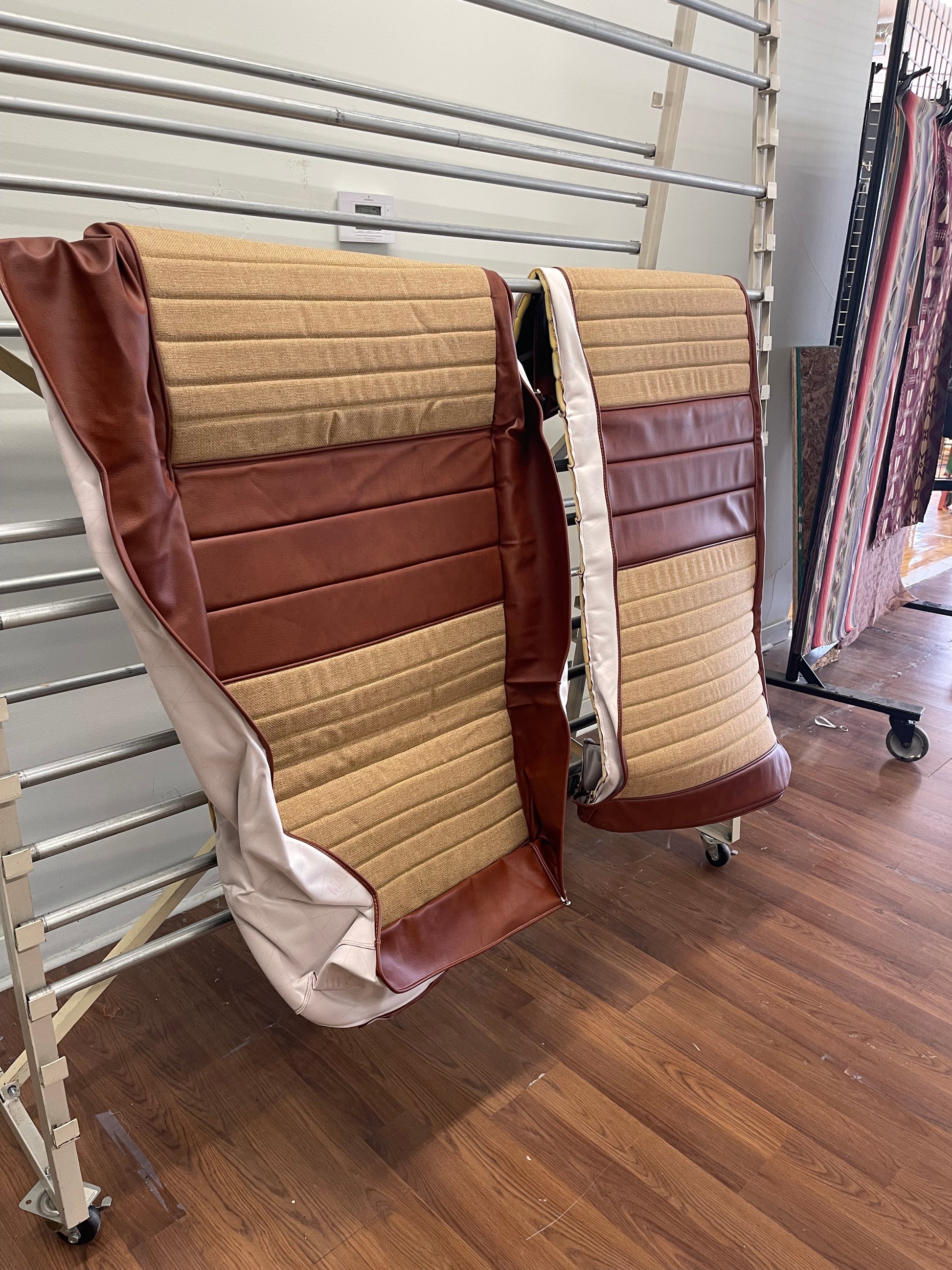 This Murphy seat kit was sewn during a materials test run and is now hanging out in the B62 Stockroom. It’s a brand-new, never-installed cover set in Old Whiskey vinyl with Oak tweed inserts, built to full B62 spec and ready to ship.